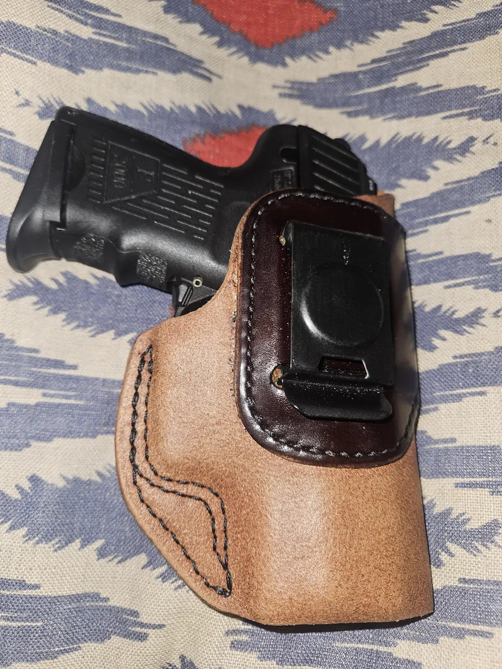 holster. It features a steel-reinforced mouth and leather top band, with your choice of trim in Acorn, Black or Cuban brown. The clip is high-quality spring steel and offers excellent security. Designed for use with a 1.5" belt.